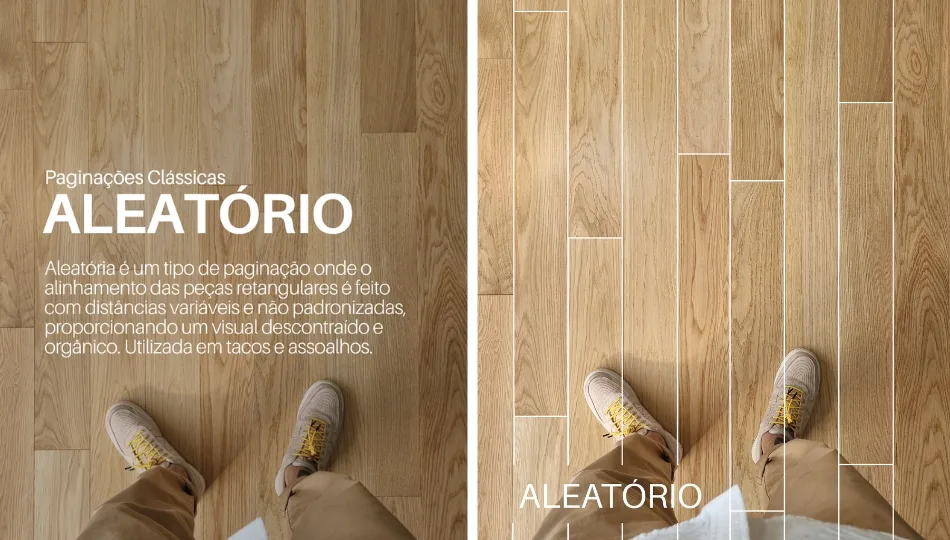 A Aleatória é uma paginação onde o alinhamento das peças retangulares (tacos ou assoalhos) é feito com distâncias variáveis e não padronizadas, proporcionando um visual descontraído, orgânico e natural.