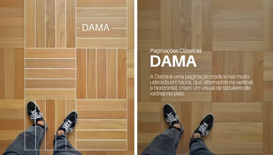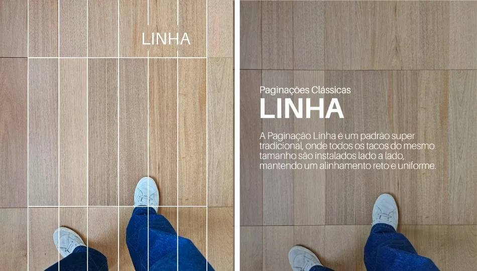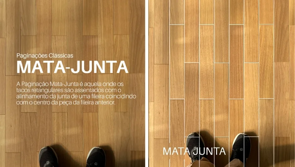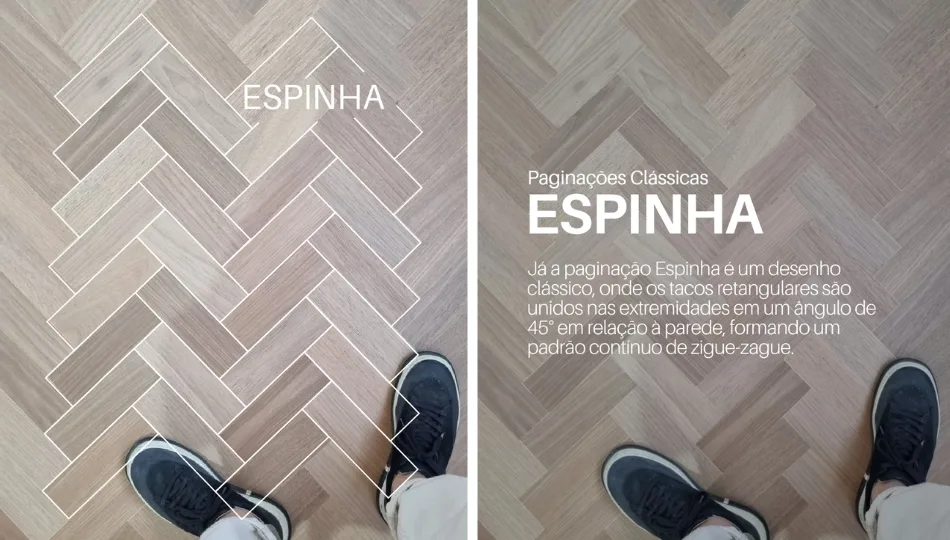 (Nota: Existe ainda o padrão Chevron, não mostrado aqui, onde as pontas das peças são cortadas em ângulo de 45° ou 60°, formando um “V” perfeito e contínuo.)